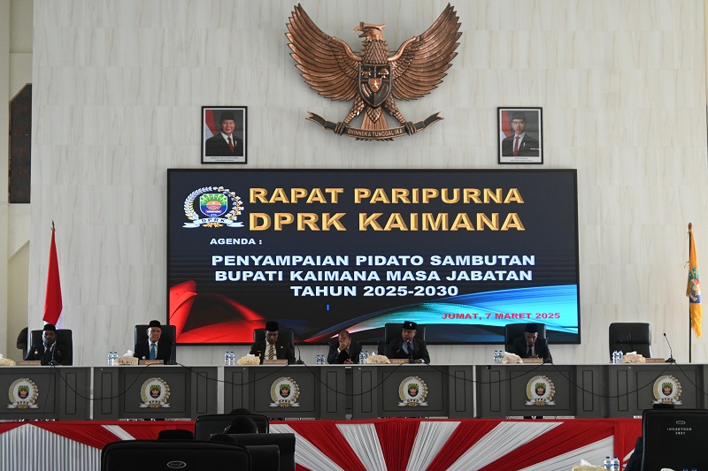 KOMINFO KAIMANA – Bupati Drs. Hasan Achmad, M.Si., dan  Wakil Bupati Isak Wariensi, beserta Wakil Gubernur Papua Barat Drs. Mohammad Lakotani, M.Si., menghadiri Rapat Paripurna Dewan Perwakilan Rakyat Kabupaten (DPRK) Kaimana dengan agenda  Penyampaian Pidato Bupati Kaimana Periode 2025-2030, pada hari Jumat (07/03/2025) bertempat di Auditorium DPRK Kaimana.